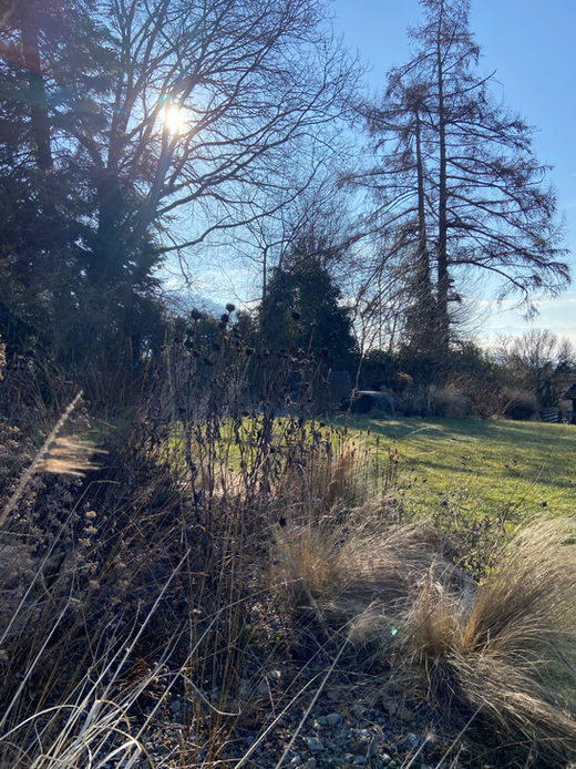 Für uns war es eine spannende Aufgabe, einen naturnahen Garten zu gestalten, der Architektur und Landschaft unterhalb des Heiligenbergs harmonisch verbindet – und dabei pflegeleicht, ästhetisch ansprechend und kinderfreundlich ist. Mit rund 900 Stauden und vielen Frühblühern haben wir eine farbenfrohe Pflanzung geschaffen, die das ganze Jahr über lebendig bleibt und wenig Aufwand in der Pflege erfordert. Heimische Gehölze strukturieren das Gelände, bieten Sichtschutz und öffnen gezielt den Blick auf Tal, See und Berge. Große Steine schaffen abwechslungsreiche, sonnige und schattige Plätze, die auch Kindern zum Entdecken und Spielen einladen. Wildblumenwiesen und Obstbäume fördern die Artenvielfalt und machen den Garten zu einem lebendigen, sich ständig wandelnden Ort – ein grünes Erlebnis für Groß und Klein, das mit viel Liebe zum Detail umgesetzt und gepflegt wird.